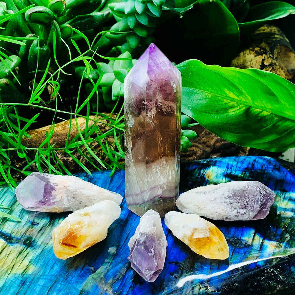 - 1 unique multicolor fluorite point - 2 citrine shards - 3 amethyst shards